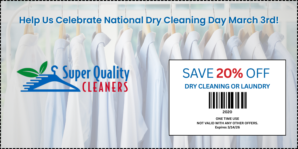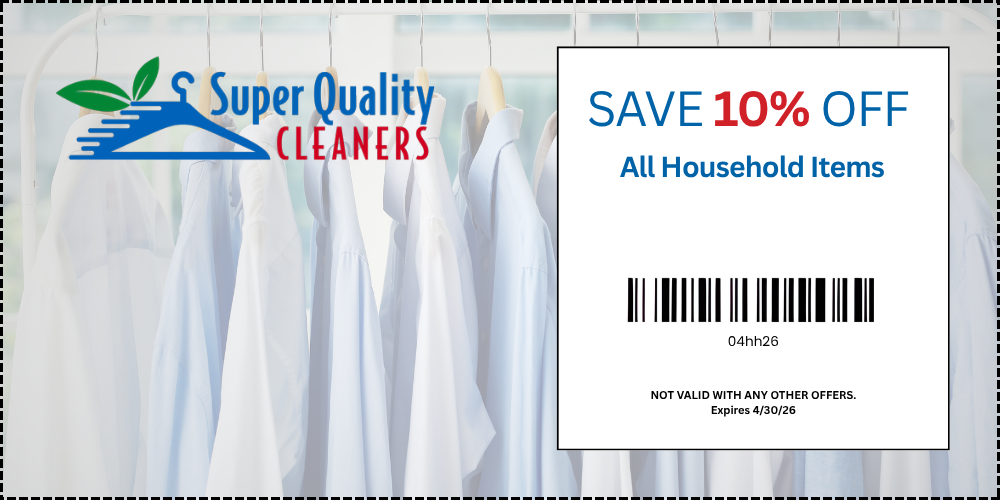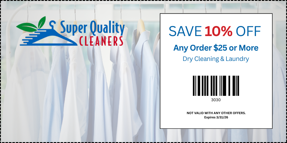 Whether you’re a regular customer or just starting out with Super Quality Cleaners, bring in the coupons below to receive the finest dry cleaning or laundry services at any of our seven convenient locations.